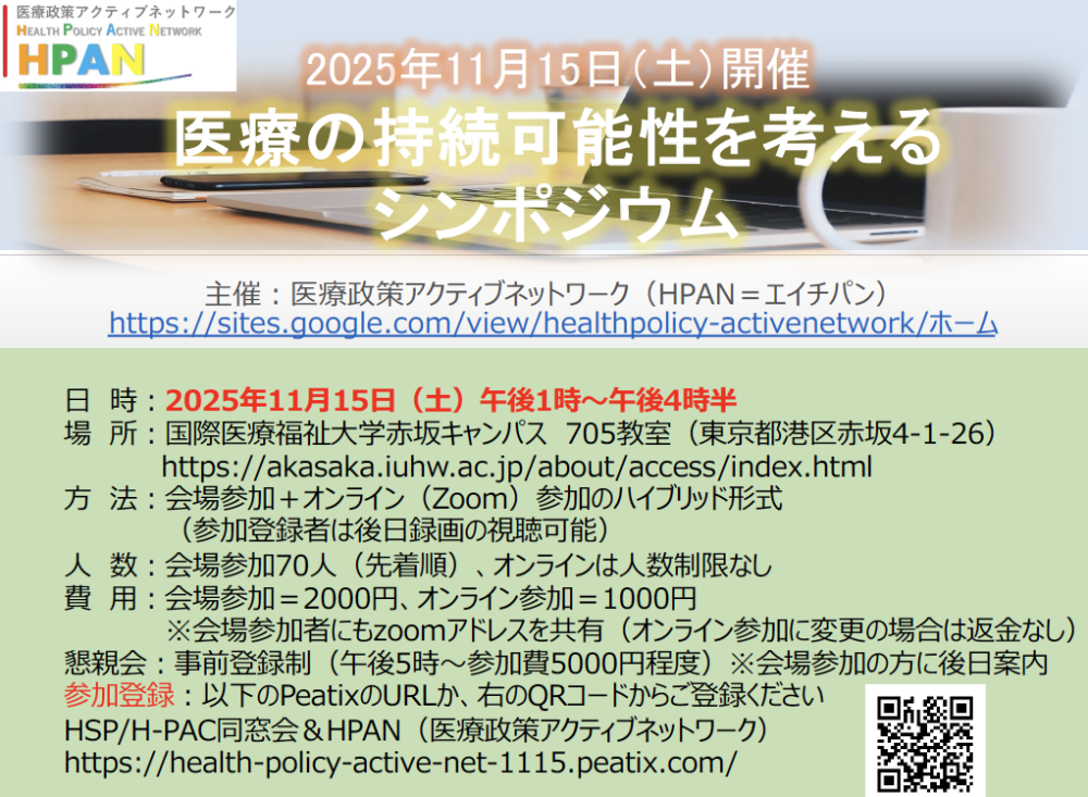 イベント名:医療の持続可能性を考えるシンポジウム 日 時:2025年11月15日(土)午後1時〜午後4時半 場 所:国際医療福祉大学赤坂キャンパス 705教室(東京都港区赤坂4-1-26) 方 法:会場参加+オンライン(Zoom)参加のハイブリッド形式 ※参加登録者は後日録画(オンデマンド)の視聴可能 人 数:会場参加70人(先着順)、オンラインは人数制限なし 費 用:会場参加=2000円、オンライン参加=1000円 ※会場参加者にもzoomアドレスを共有(オンライン参加に変更の場合は返金なし) 懇親会:事前登録制(午後5時〜参加費5000円程度)※会場参加の方に後日案内 【プログラム(予定)】 13:00〜13:05(05分)HPANの活動と本シンポジウムの狙い(HPAN事務局) 13:05〜13:35(30分) 基調講演:医療の持続可能性に向けた給付と負担のあり方 =鈴木康裕・国際医療福祉大学学長(元厚生労働省医務技監) 13:35〜15:25(20分×5人+予備10分) ①患者の命・生活・人生を支える高額療養費制度 =小林竜太郎・慢性骨髄性白血病(CML)患者・家族の会 いずみの会代表 ②高額療養費の見直し議論の検証 =三原岳・ニッセイ基礎研究所上席研究員 ③薬の費用対効果〜医療技術評価(HTA)の意義 =白岩健・国立保健医療科学院保健医療経済評価センター上席主任研究官 ④医療の持続可能性とChoosing Wiselyキャンペーンの役割 =小泉俊三・Choosing Wisely Japan代表 ⑤国民皆保険制度の課題と選択肢 =前村聡・日本経済新聞編集委員 15:25〜15:35(10分) 休憩 15:35〜16:25(50分) 質疑応答&パネルディスカッション 16:25〜16:30(05分) 閉会の辞(HPAN事務局) |